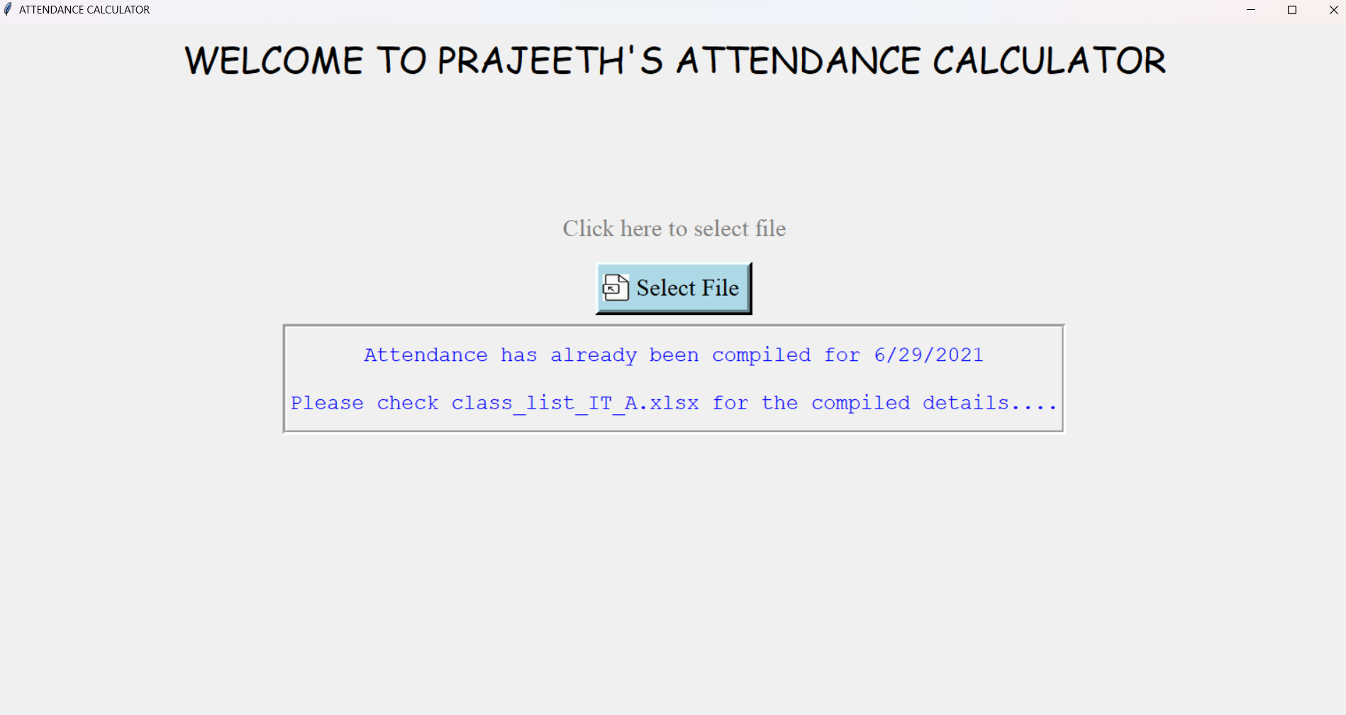 It then displays the message according to the file you have selected. If you are selecting a new file, then it will calculate the attendance and the following message will be displayed. If you have selected a file for which attendance has already been calculated, the following message will be displayed.