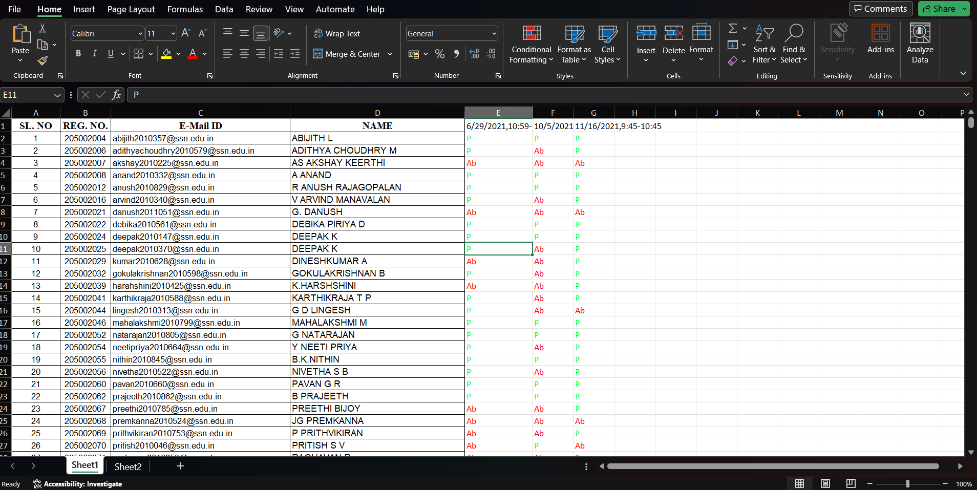 - Each day attendance is updated in an excel sheet.