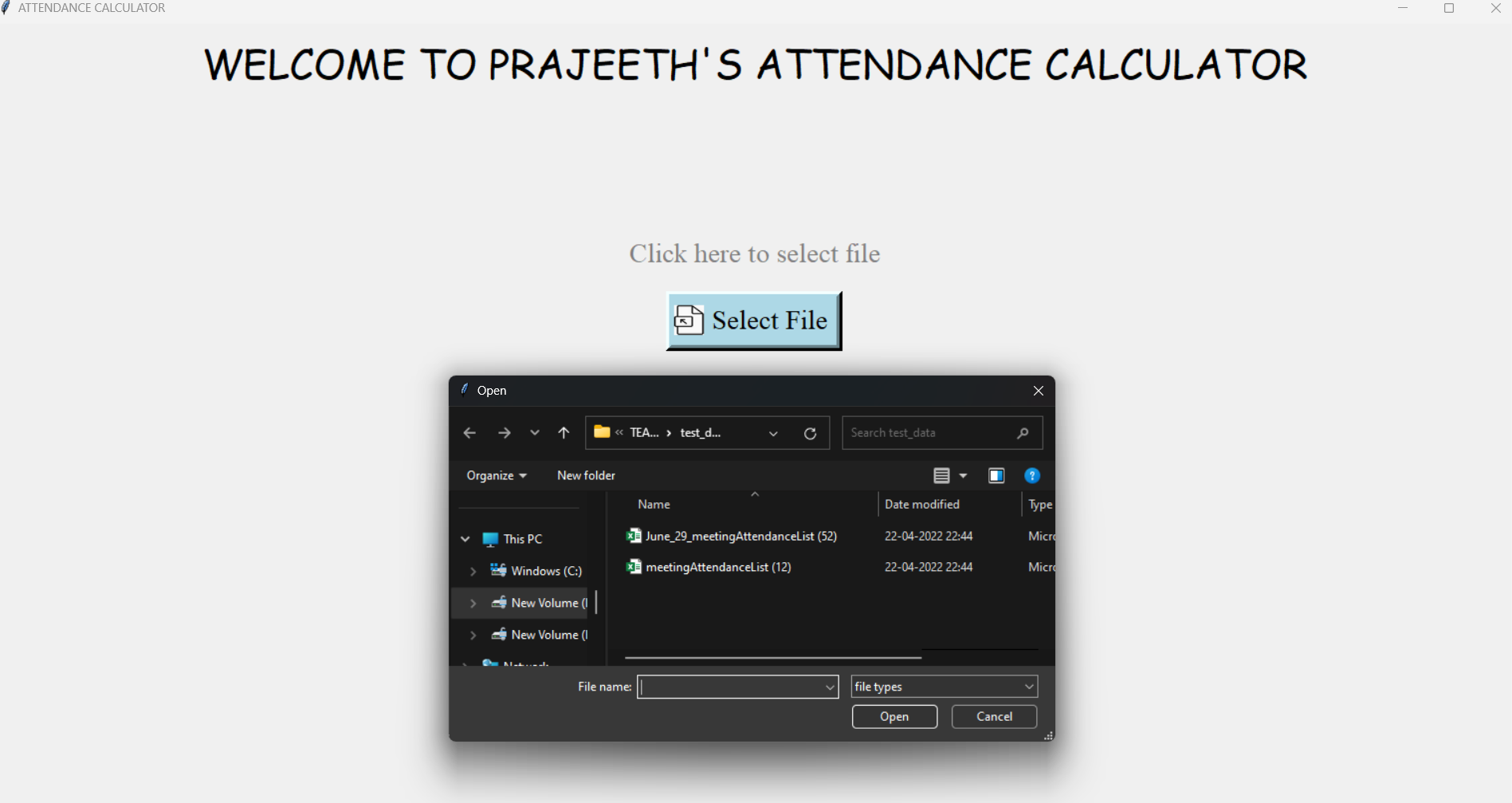 Open the Attendance calculator app. The app opens with the user interface shown below. Click the button present on the screen. Once you click the button a dialog box will open and will prompt you to select your file of choice.