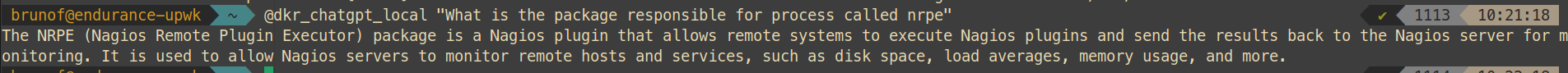 alias @dkr_chatgpt='[ "$OPENAI_API_KEY" ] || { read -sp "Please provide API KEY (not echoed): " _OPENAI ; export OPENAI_API_KEY=${_OPENAI}; }; docker run --rm --env OPENAI_API_KEY=${OPENAI_API_KEY} brunoferreira/chatgpt'