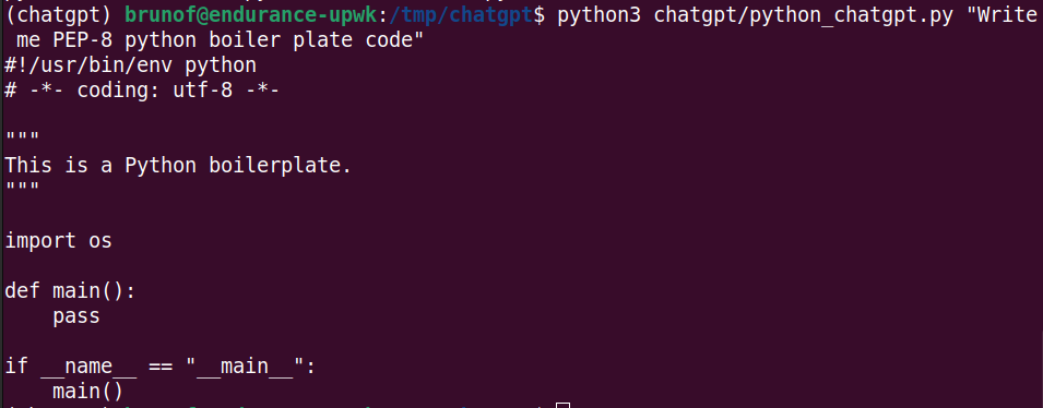 docker run --env-file ./env brunoferreira/chatgpt "Write me PEP-8 python boiler plate code"