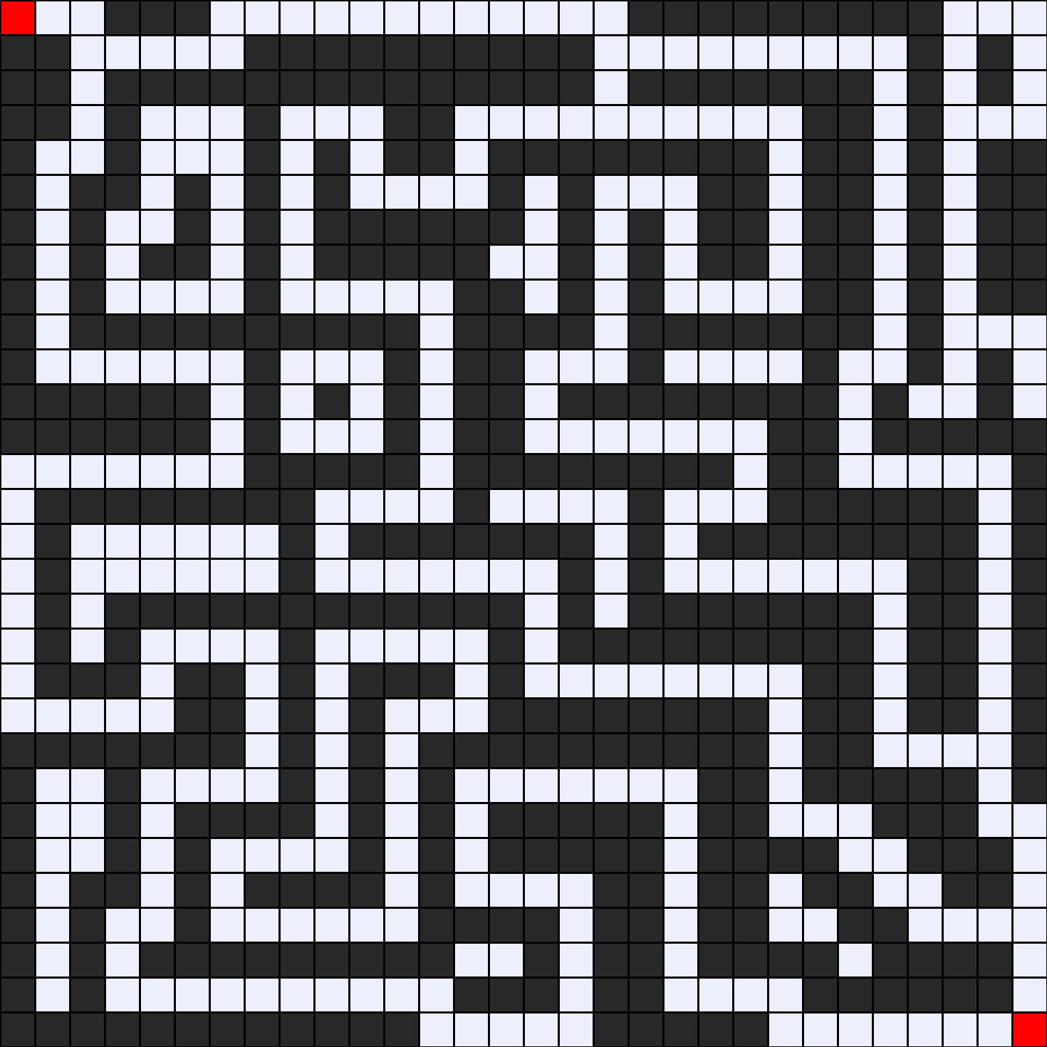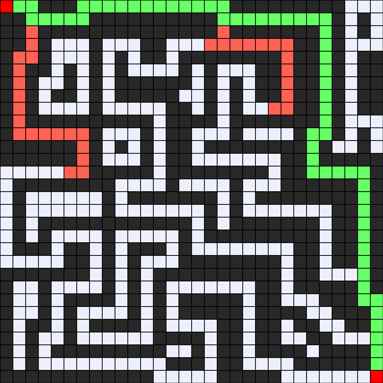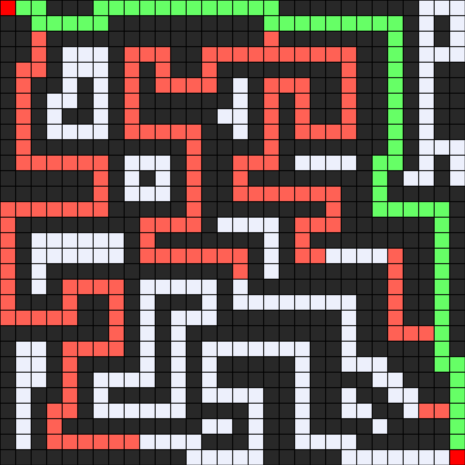 - Se inicia en la posición (1,1) y se llega a la meta en la posición (30, 30).