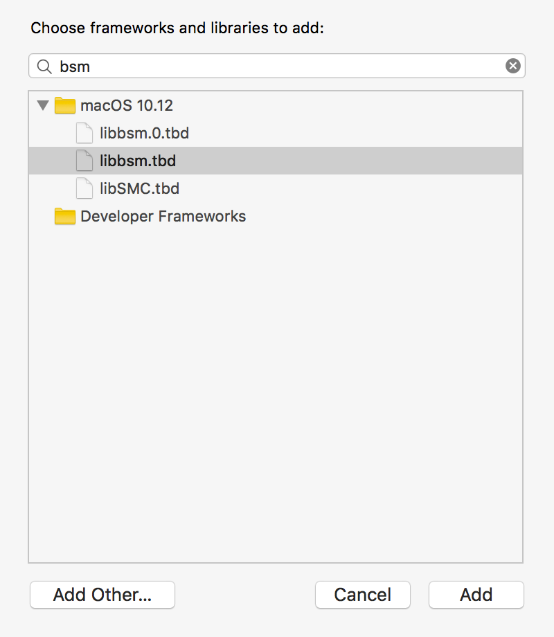 Select your project in Xcode, then click on the 'Build Phases' tab. In the 'Link Binary With Libraries' section, click the '+' to bring up the prompt for adding frameworks and libraries. Type bsm in the search box. Then select libbsm.tbd and click 'Add':