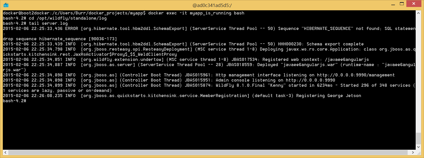 Now it is time for a victory dance around the room! You have your first Java EE application deployed as part of a Docker container. Remember, Ctrl-C to shut down the app server.
