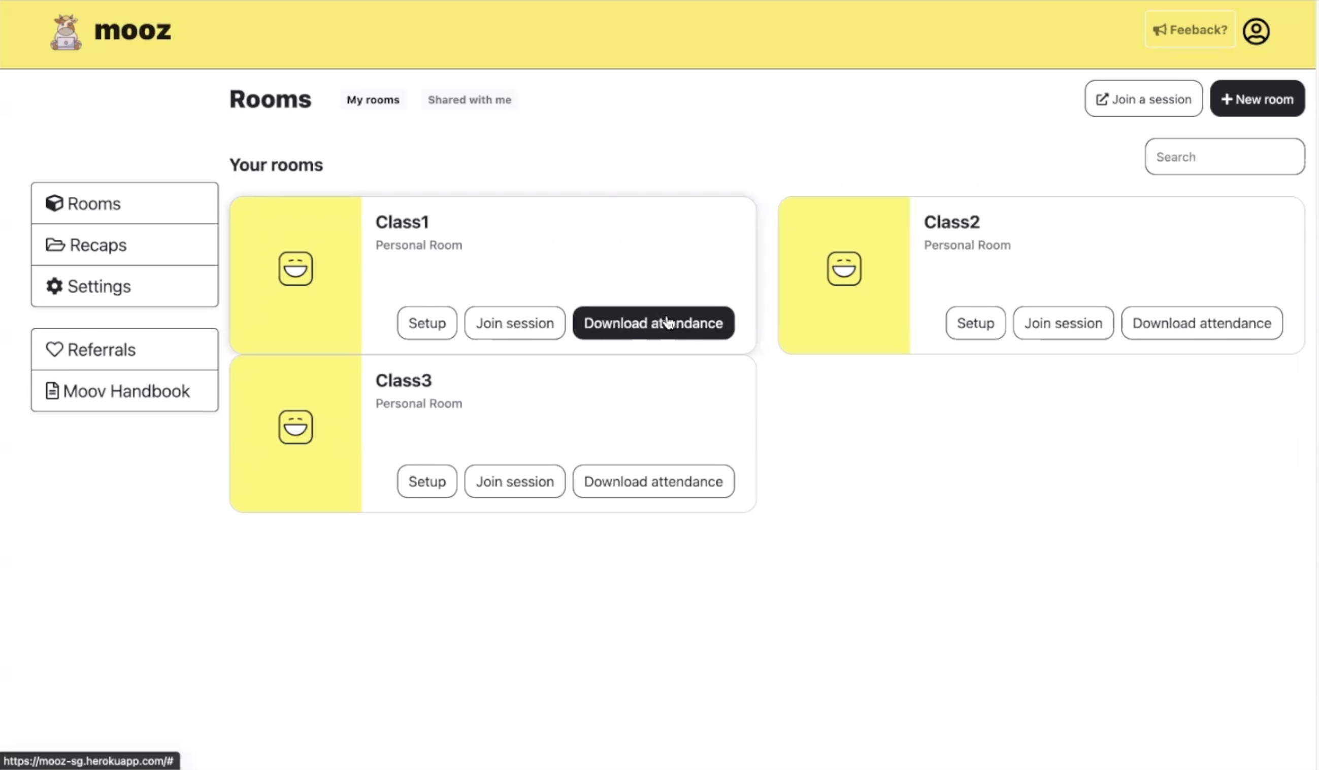 If you are signing in as an admin (these could be teachers or school staff), you will see an additional button called "Download attendance" in the lobby. Everytime a student joins the class, he/she will be added to the attendance list automatically. The user with an admin role can choose to download the attendance any time.