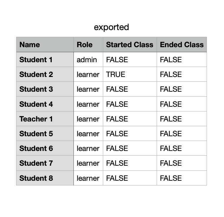 Upon downloading the attendance sheet, you will see a list of all the students and their attendance (denoted by TRUE or FALSE) when class is started and ended.