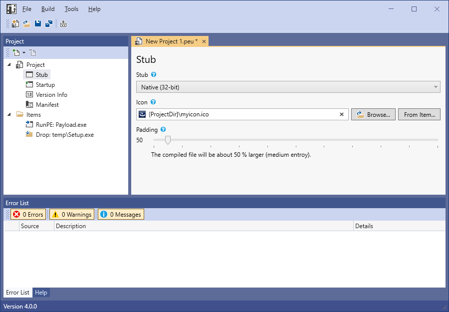 Obfuscation and evasive features are fundamental to the design of PEunion and do not need further configuration. The exact implementation is fine tuned to decrease detection and is subject to change in future releases.