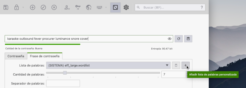 En el boton de "Generador de Contraseñas" selecciona "Frase de Contraseña" y "Lista de Palabras"