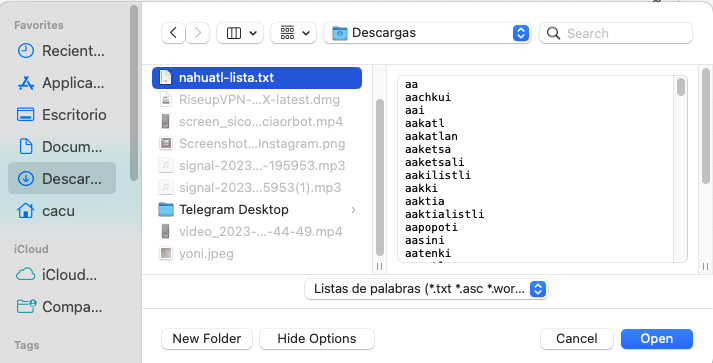 Seleccionas el archivo nahuatl-lista.txt que acabamos de descargar: