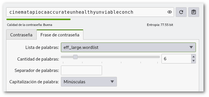 En el boton de Generador de Contraseñas selecciona Frase de Contraseña y Lista de Palabras