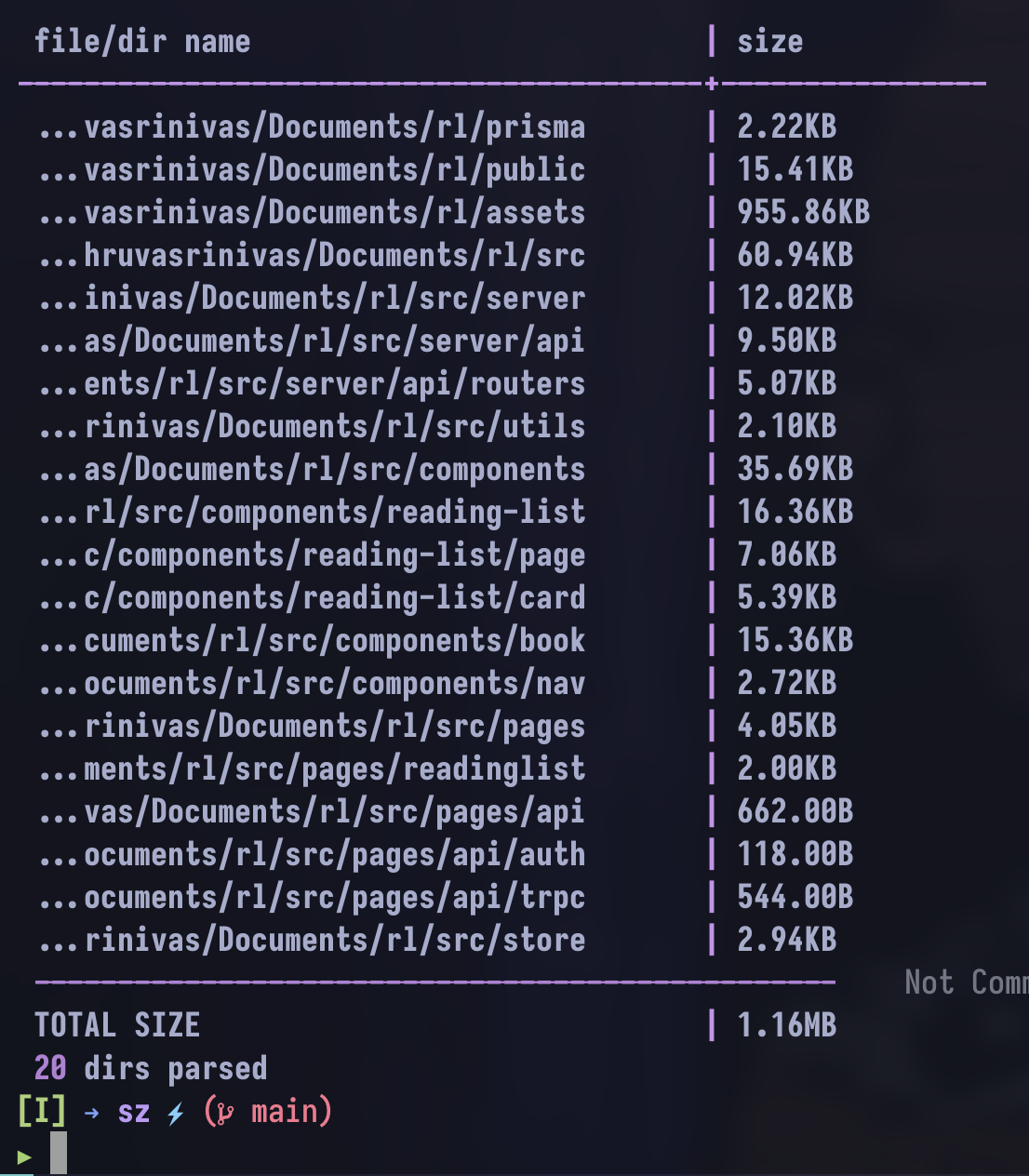 - to find the size of the current directory (excluding gitignored and hidden files/files in gitignored or hidden directories)