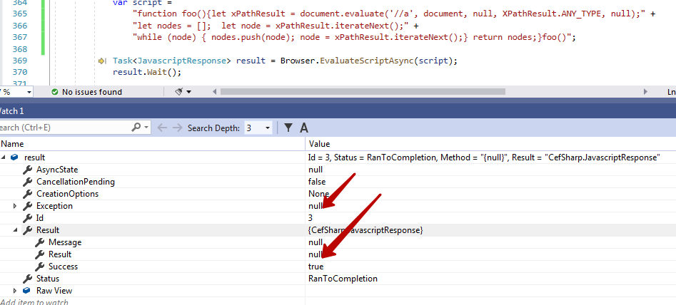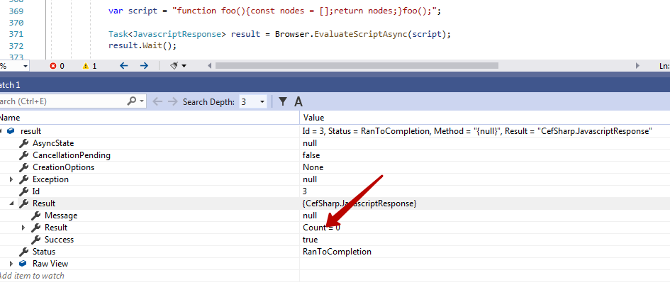 Hello! Why script executing successfully in Chrome console returns null result in EvaluateScriptAsync (no E) ?