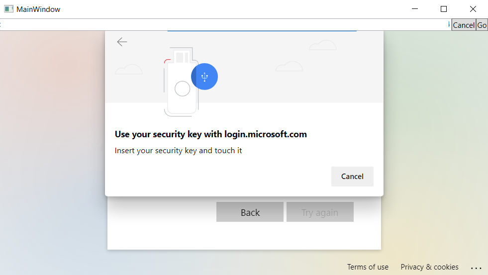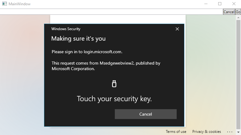I am working on a WPF application that uses the CefSharp browser control to authenticate users with security key.