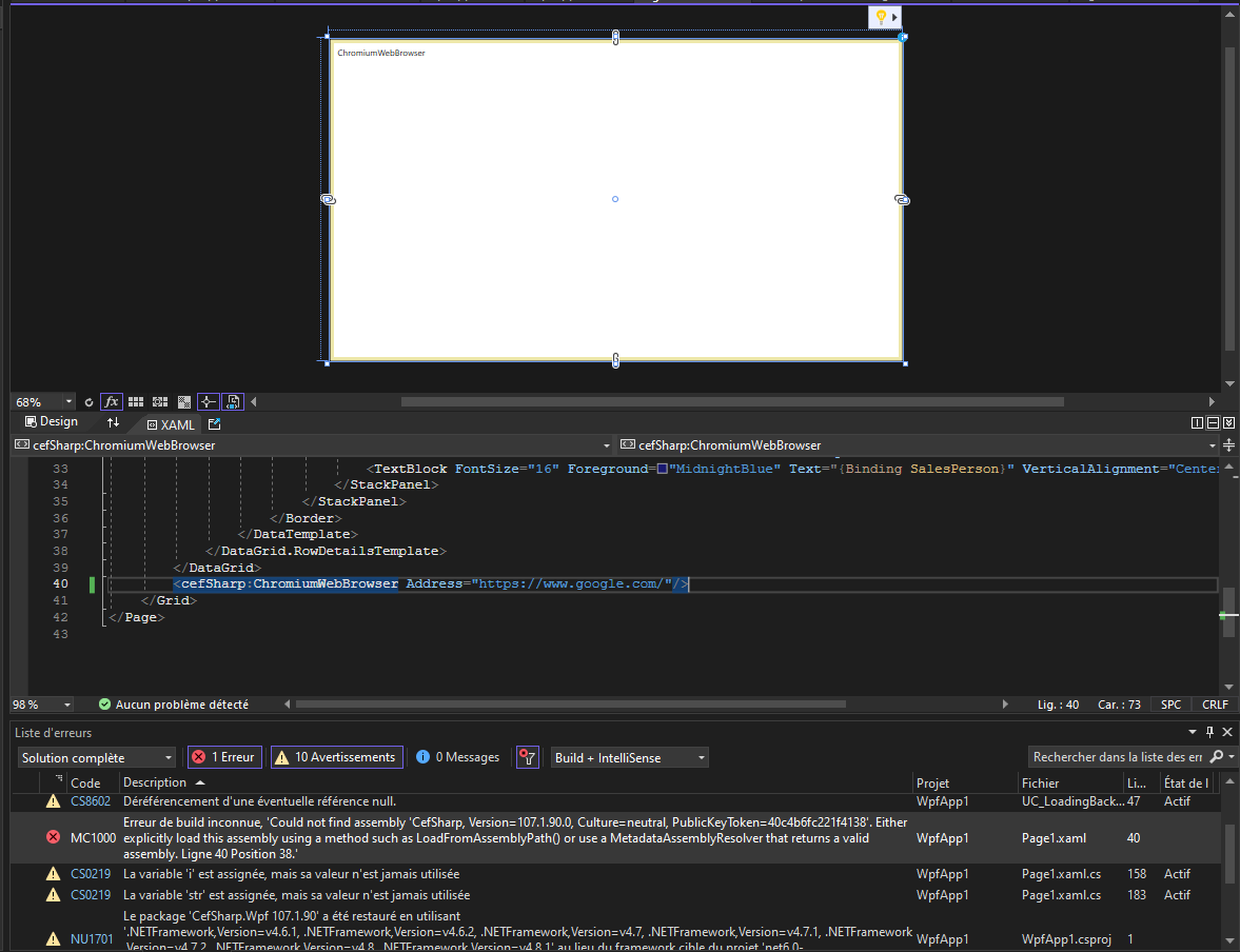 Error MC1000 Unknown Build Error, 'Could not find assembly 'CefSharp, Version=107.1.90.0, Culture=neutral, PublicKeyToken=40c4b6fc221f4138'. Either explicitly load this assembly using a method such as LoadFromAssemblyPath() or use a MetadataAssemblyResolver that returns a valid assembly. Line 40 Position 38.' ../page1.xaml