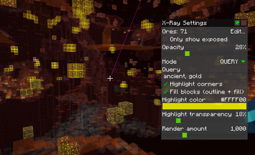 ore, ancient). - Rendering: Boxes, Lines, or Both. Tracers cancel view-bobbing.