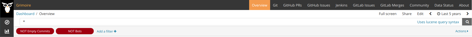 If you are using Kibiter with the GrimoireLab tools, you will see a quick menu at the top of the page, like the one below: