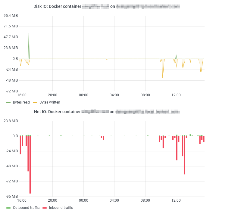 OK - containername (b343972b5de9) is Up 3 days - CPU: 8.65%, Memory: 10.62 GiB, PIDs: 304 | cpu=8.65%;;;; pids=304;;;; mem=11403138171B;;;;33565169418 net_send=2570000000B;;;; net_recv=2750000000B;;;; disk_read=1580000000B;;;; disk_write=3760000000B;;;;