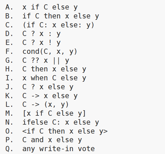 总体上,开发者们希望引入某种形式的 if-then-else 表达式,但投票后却没有哪种方案能取得绝对的优势。概括起来,分歧的问题主要有:是否用标点符号、是否复用关键字、是否复用圆括号、是否引入新关键字、是否引入新语法……