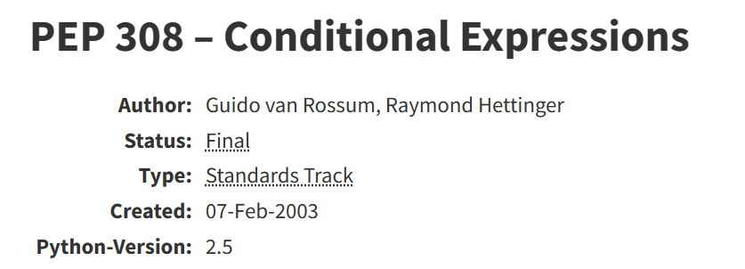 最初,由于时常有人请求添加 if-then-else(三元)表达式,因此在 2003 年 2 月,PEP 308 – Conditional Expressions 被提了出来,目的是让社区选出一个让多数人支持的方案。