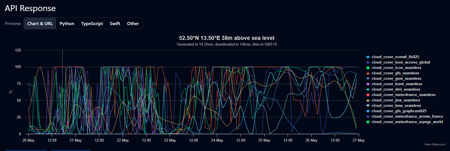 As shown below, different weather models (like Meteo-France or GFS) interpret 100% cloud cover differently: