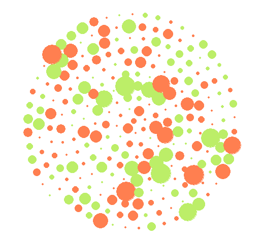1: circle of bytes: using an archimedean spiral each byte value is represented with a coloured circle which size indicates the amount of deviation from sigma. A green colour indicates positive sigma value whilst red indicates a negative sigma value. Blue little circles represents byte values that do not appear in the file