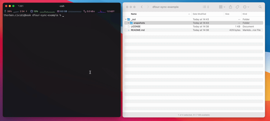 Built on top of this we also are testing dfour-sync, a GitHub action to synchronise files in a folder inside a GitHub repository with workspaces automatically (via the GitHub action triggers like push, pull request, manual etc.). For examples head over to dfour-sync or the example repository to see it in action.
