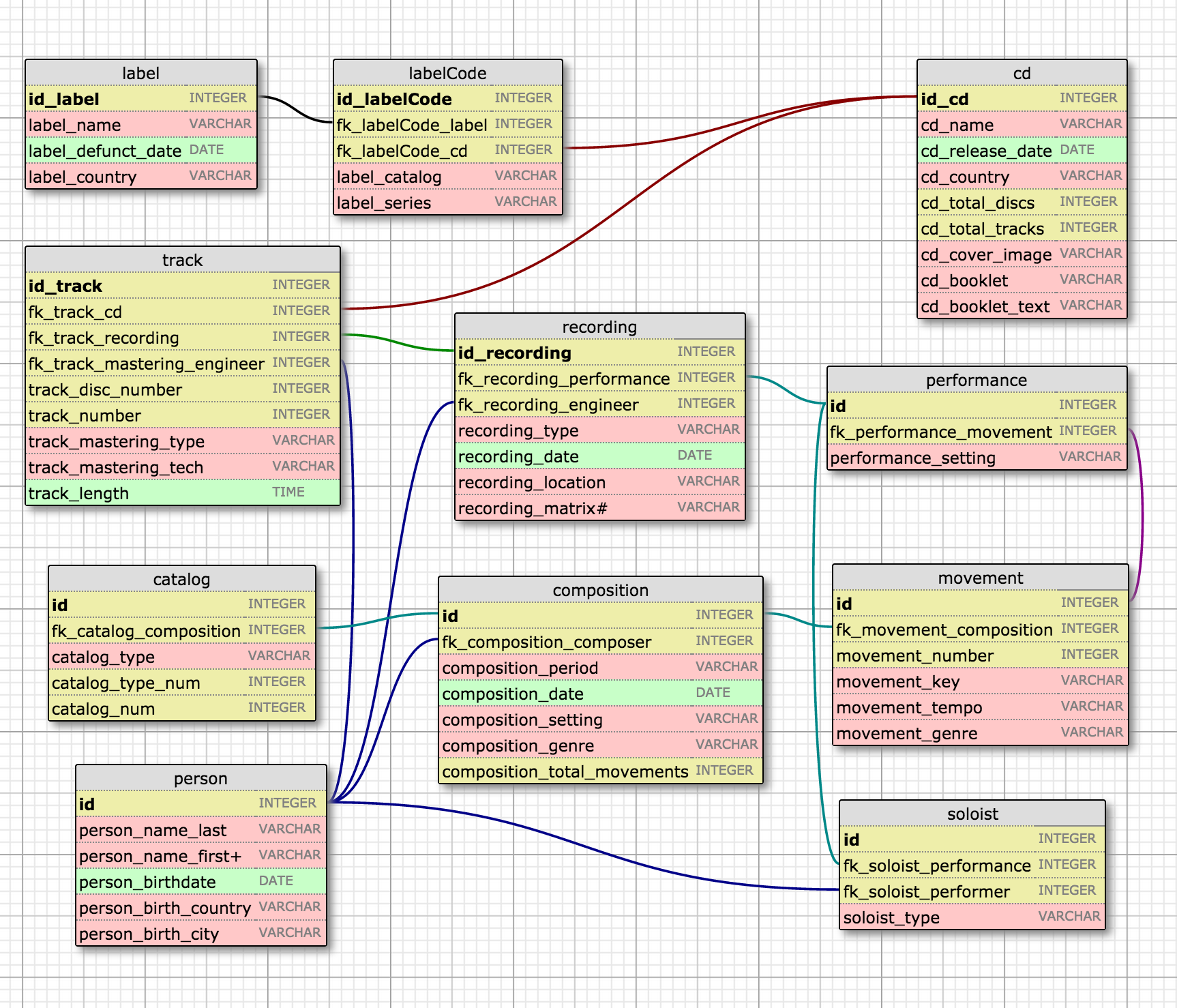 The following schema will support all relevant metadata for albums that contain single-instrument and single-performer works that may be standalone pieces or multi-movement works (like Sonatas):