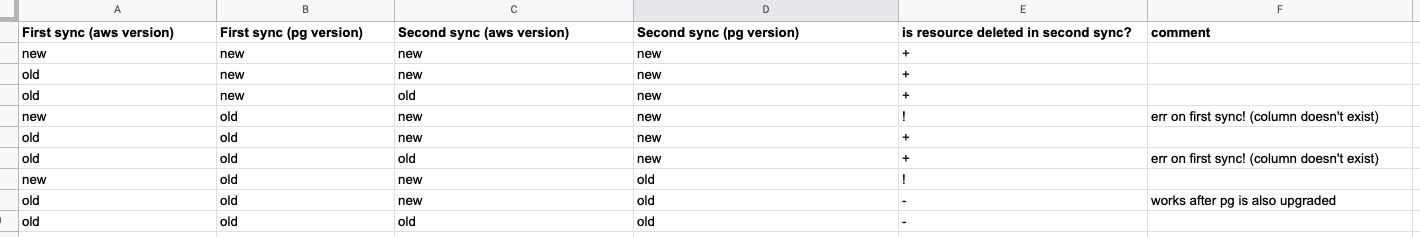 testing matrix (two syncs, different versions for first and second sync
