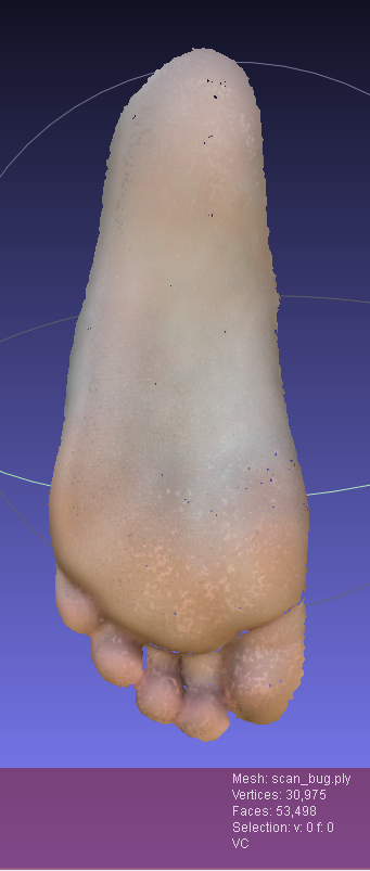 Actually i'm using this .ply and then reconstructing with "ball pivoting" with the default and when I export it to .obj it has a lot of holes on the plantar foot: