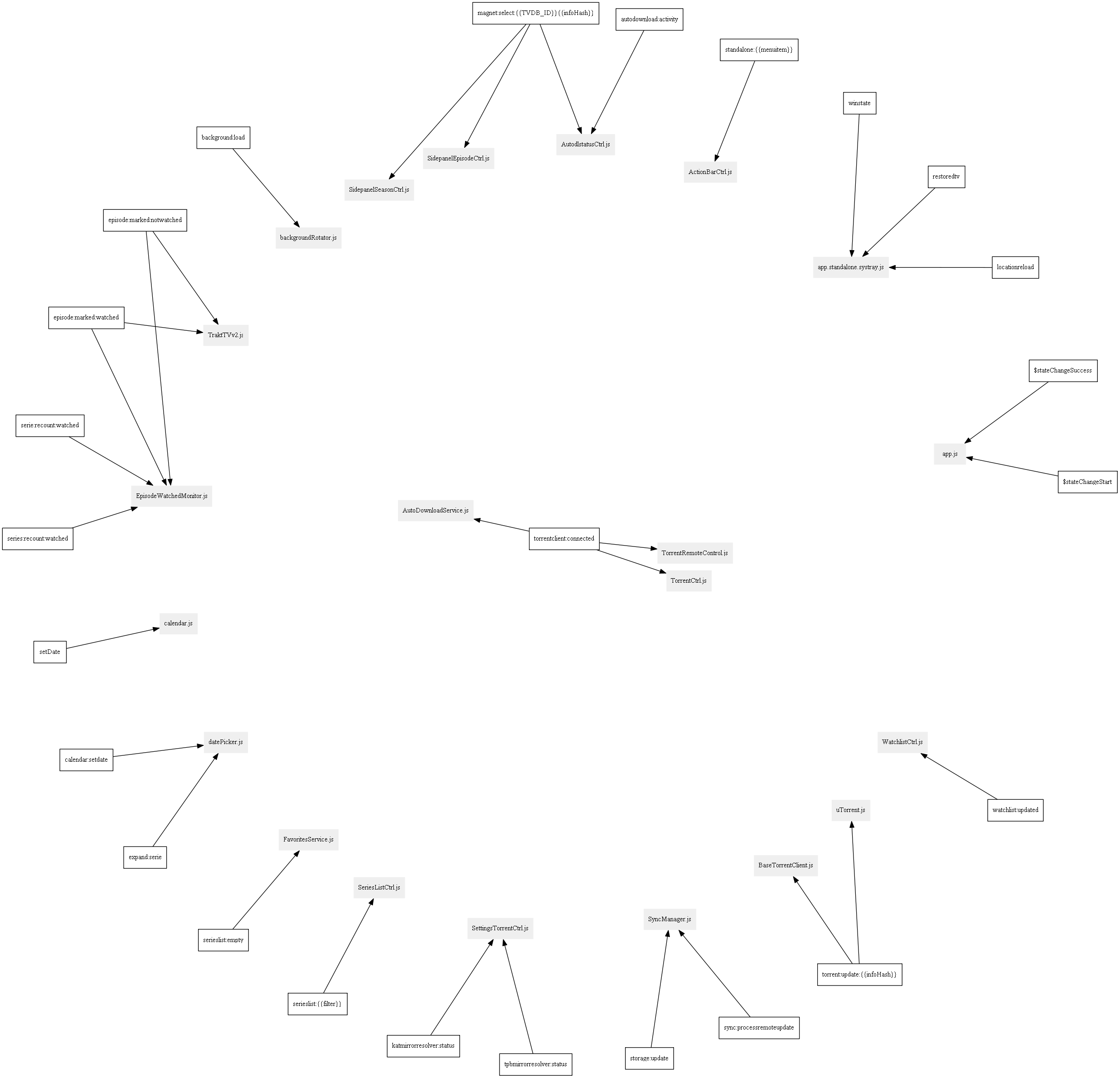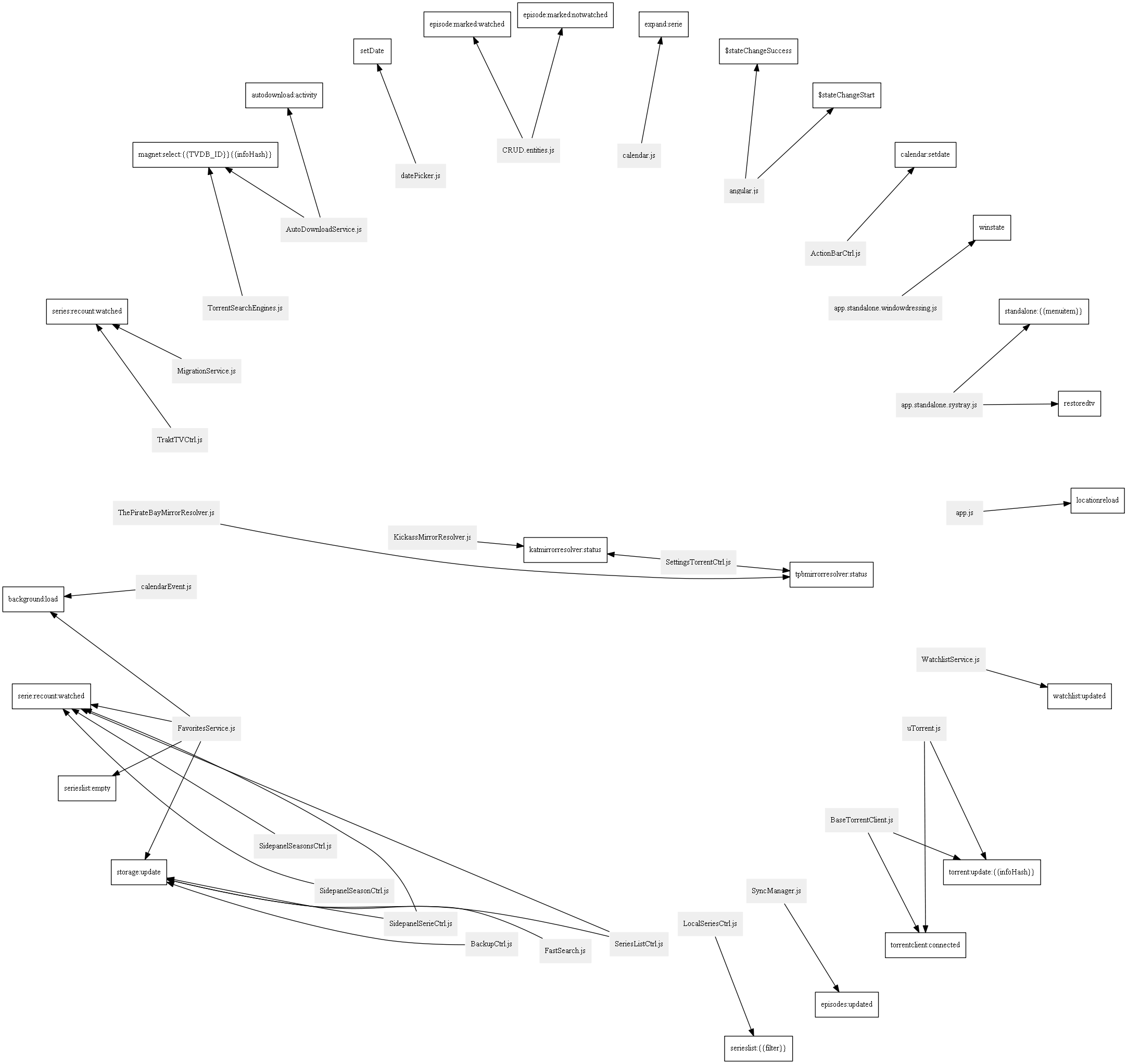 Throughout Services and Directives in DuckieTV, events are published on the $rootScope and subscribed to by others. This keeps the configuration modular, allows easy extending at key points and prevents tight coupling.