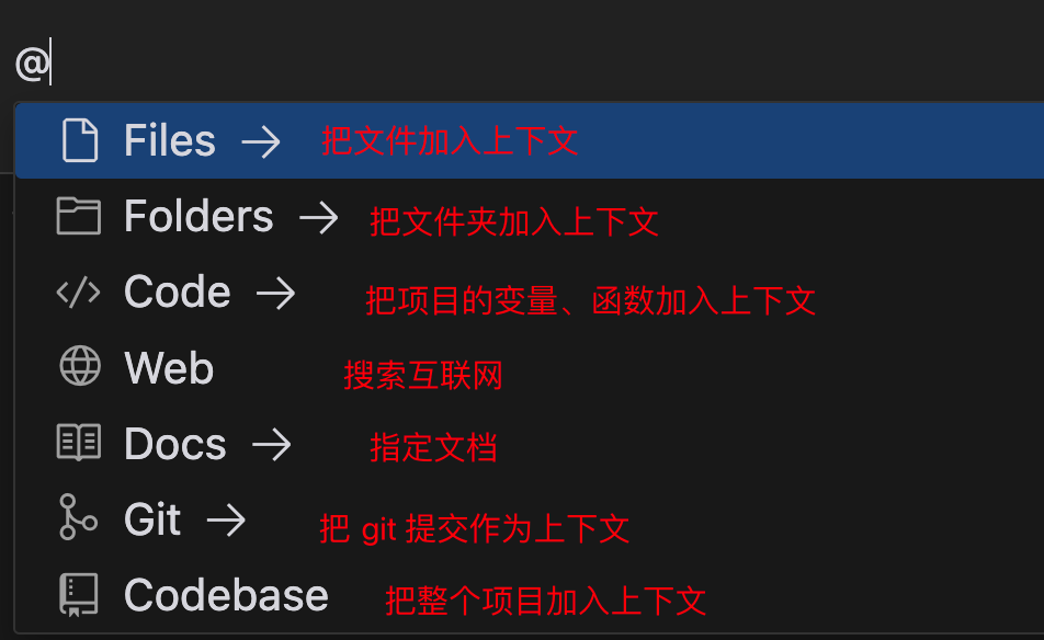 那 cursor 无论怎么说都是一个工具,它的核心是提高我们的效率。我会它当做成雇的初中级工程师,所以我在让它帮我完成工作前,我肯定会事无巨细的告诉它这个工作如何完成,并且我会通过 @ 文件能力,仅仅把相关的上下文给他,来防止它上下文太大导致回复不准确问题(也就是产生幻觉),所以有三个能力在使用 cursor 非常非常重要: