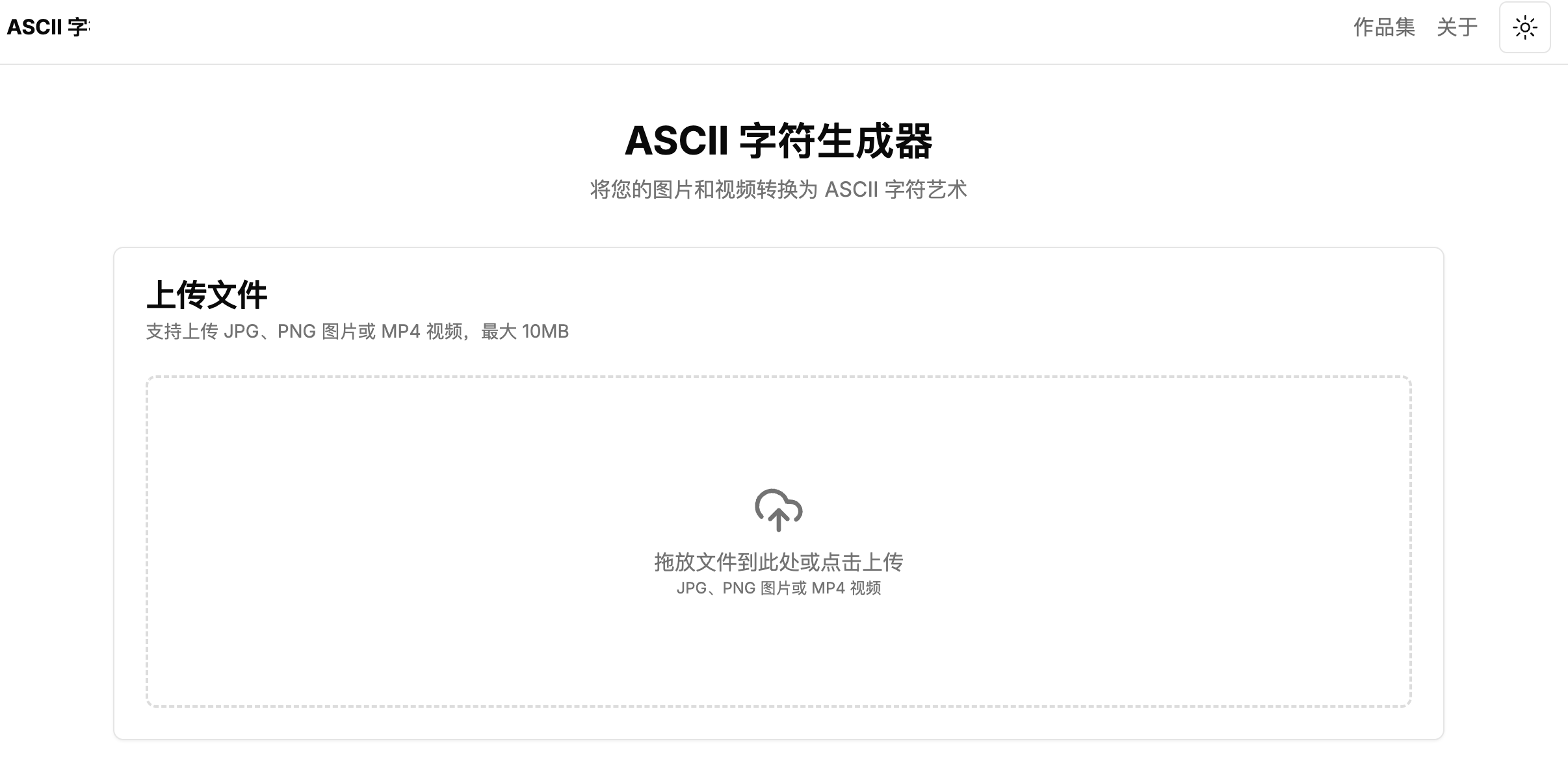 左边是 logo ,右边是关于按钮,关于里面也就是一个内容展示,介绍这个项目,说明图片和视频是如何转为 ASCII 的原理,页面简单美观