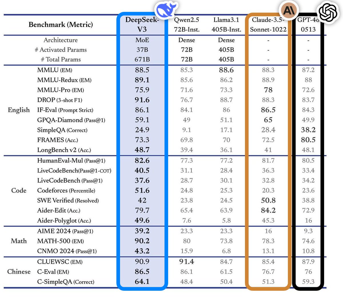 - 最重要的是 Deepseek 是开源的,DeepSeek V3 发布并同步开源,直接在外网刷屏了。延续便宜特点的基础之上,DeepSeek V3 发布即完全开源,直接用了 53 页论文把训练细节和盘托出的那种。