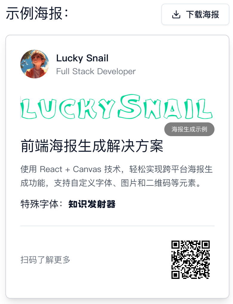 如果你遇到上面的一种,那你不用再找了,我要一口气讲清楚这些坑的解决方案,最终给你一个兼容性良好的海报生成示例代码。本文章更多分享海报开发过程中遇到的问题,如果你想要全面了解将海报下载的方案,请看:https://www.luckysnail.cn/posts/post-20 。下面我们进入正题: