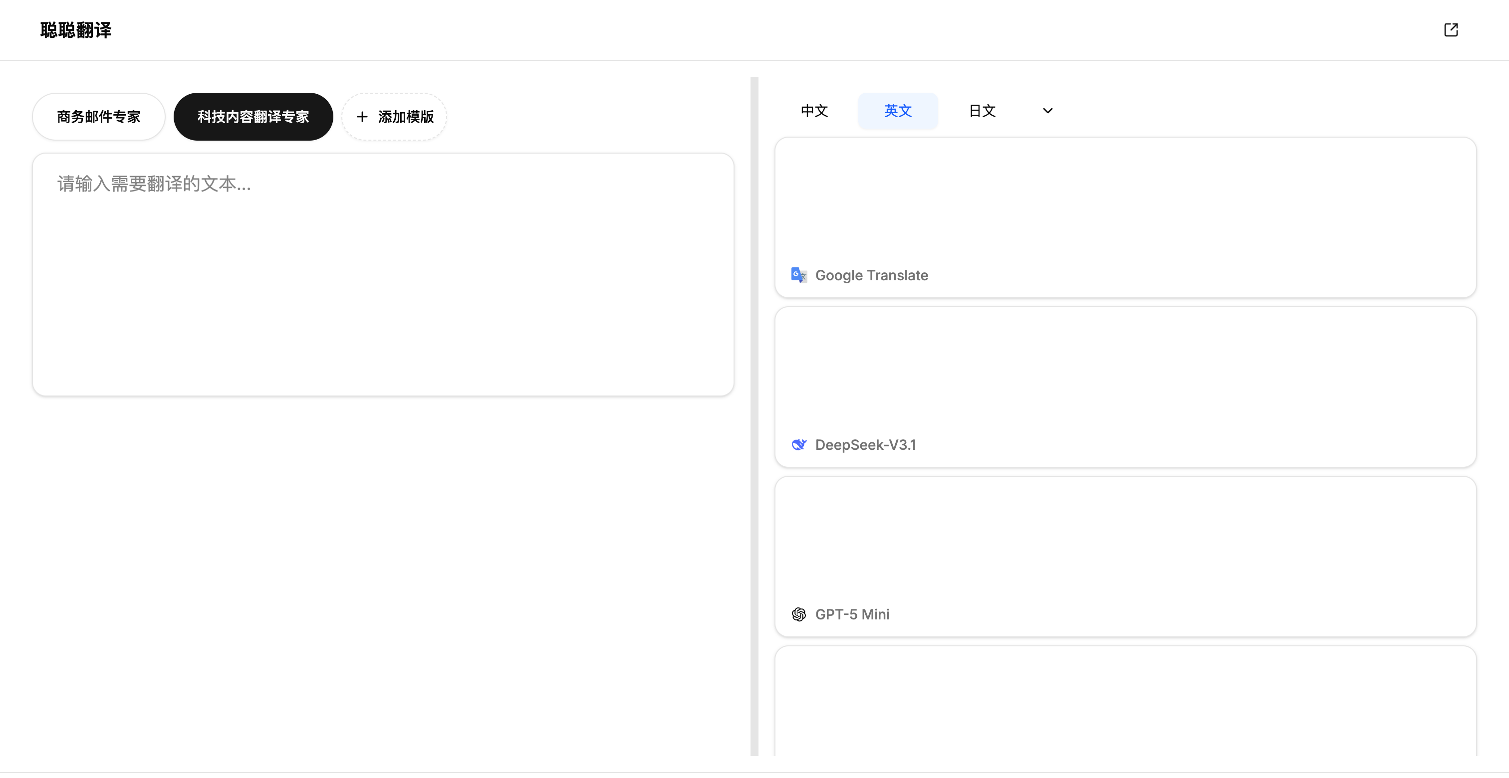 由于英语很差劲,所以一直都是谷歌翻译的深度用户,但是看到 AI 翻译的内容和谷歌翻译的对比后,我发现谷歌的机器翻译真的太差劲了!真的是由俭入奢易,由奢入俭难。干脆让 AI 快速 vibe coding 一个吧!说干就干!因为是谷歌翻译的深度用户,UI 直接借鉴它的就好!不过市面上的翻译工具都长一个样吧!