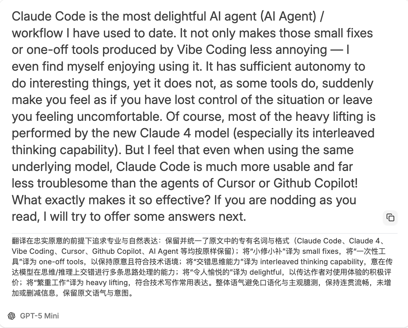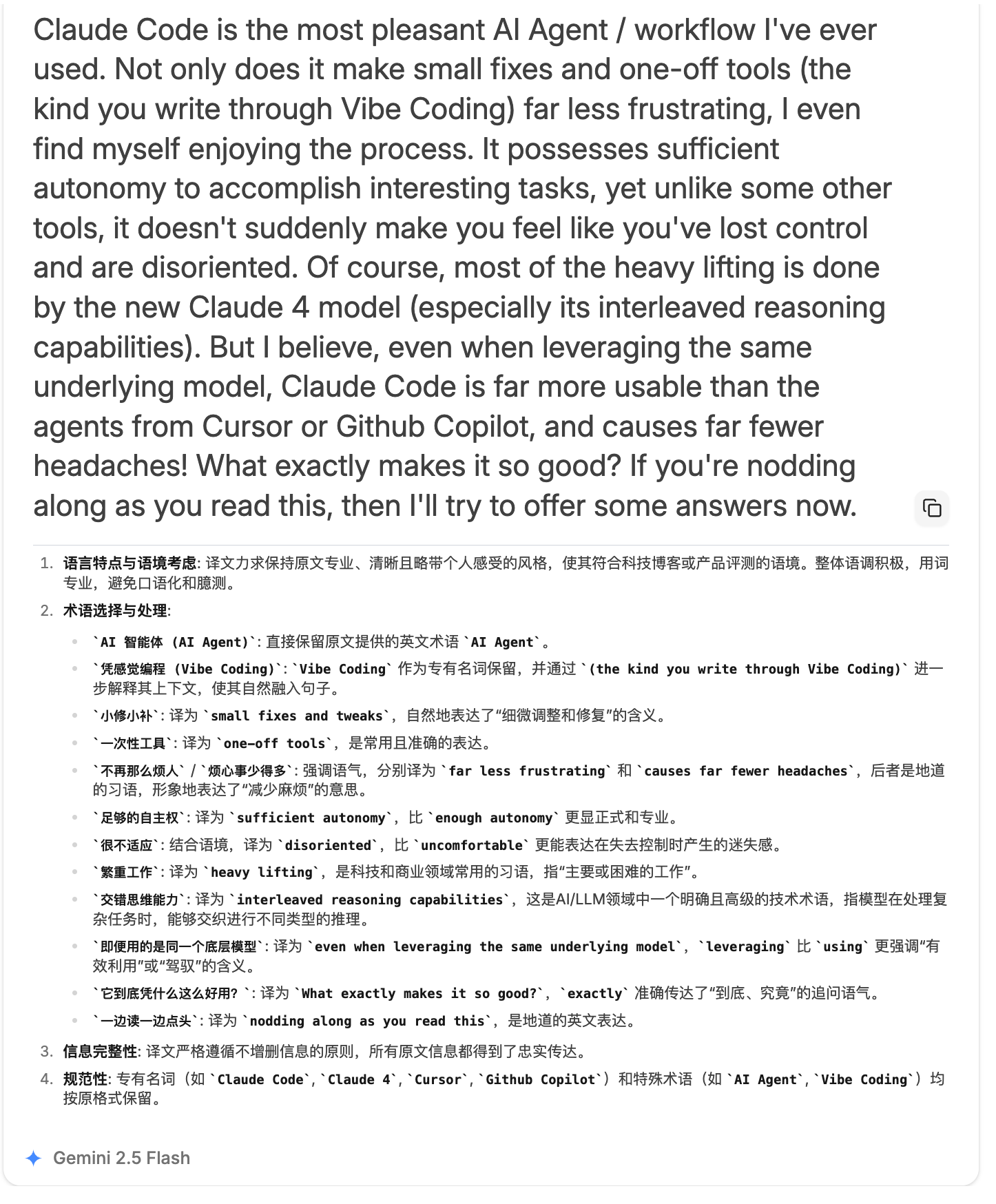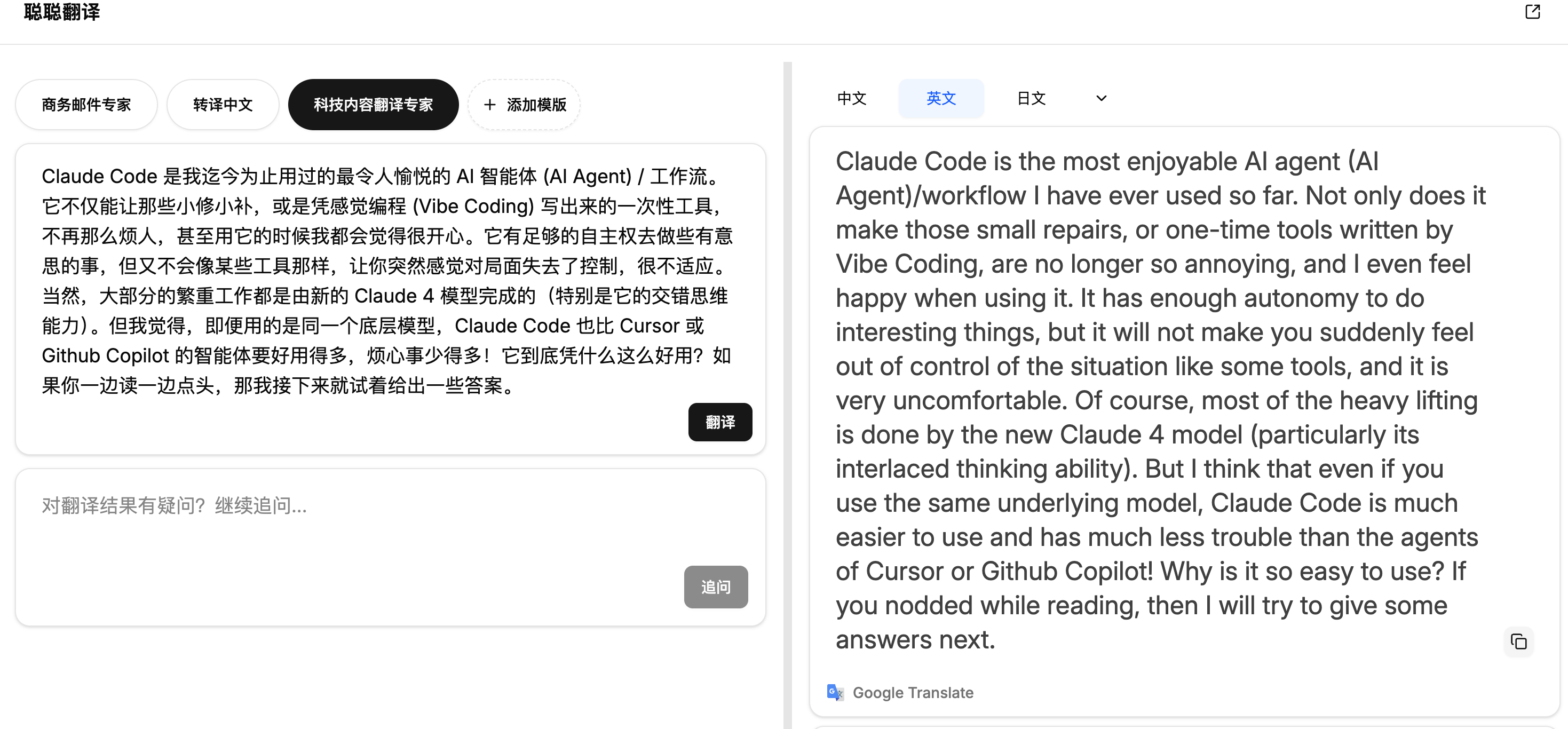 我的需求也很简单,既想要谷歌翻译的快速,也想要 AI 翻译的精准,并且有时候我还想知道它为什么这样翻译,有时候也觉得它翻译的不好想继续追问一下!