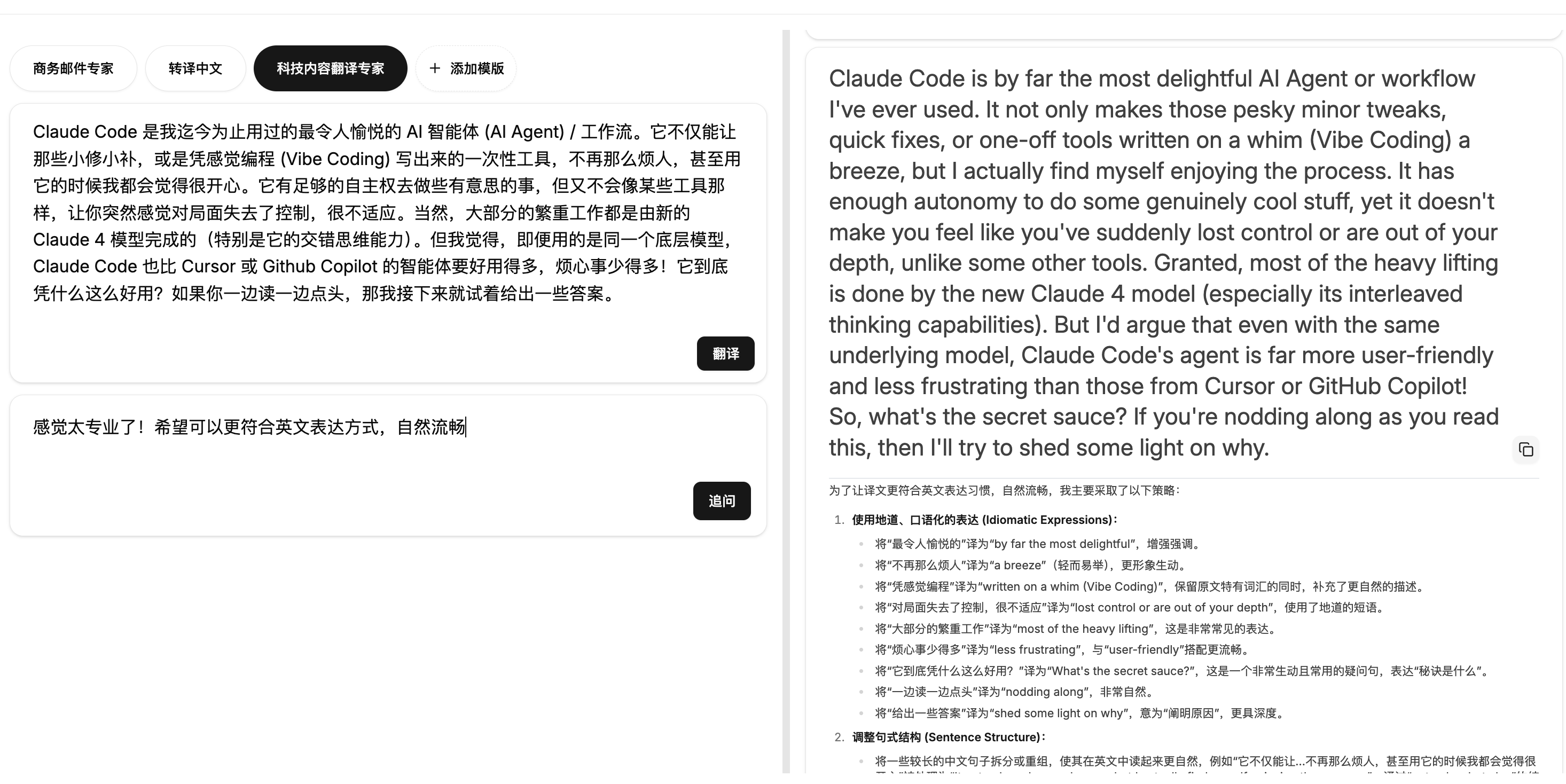 有了需求后,就把需求发给 AI,不到一会 AI 就给我一个初稿,微调一下后就得到了我自己的“谷歌翻译”,它长这样: