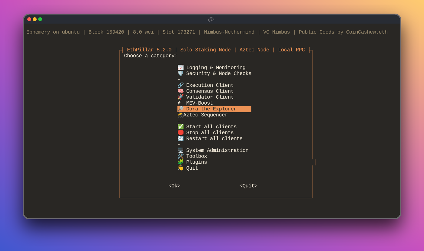 EthPillar is a free, open-source tool to set up and manage your Ethereum node with just a few commands. Whether you’re home solo staking, using Lido CSM, defending cypherpunk ethos with Aztec L2 sequencer node, or running your own RPC node, EthPillar makes everything easy—from installing clients to monitoring your system—all via a friendly text user interface (TUI).