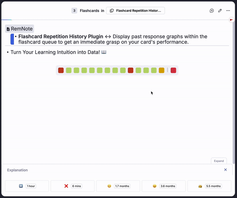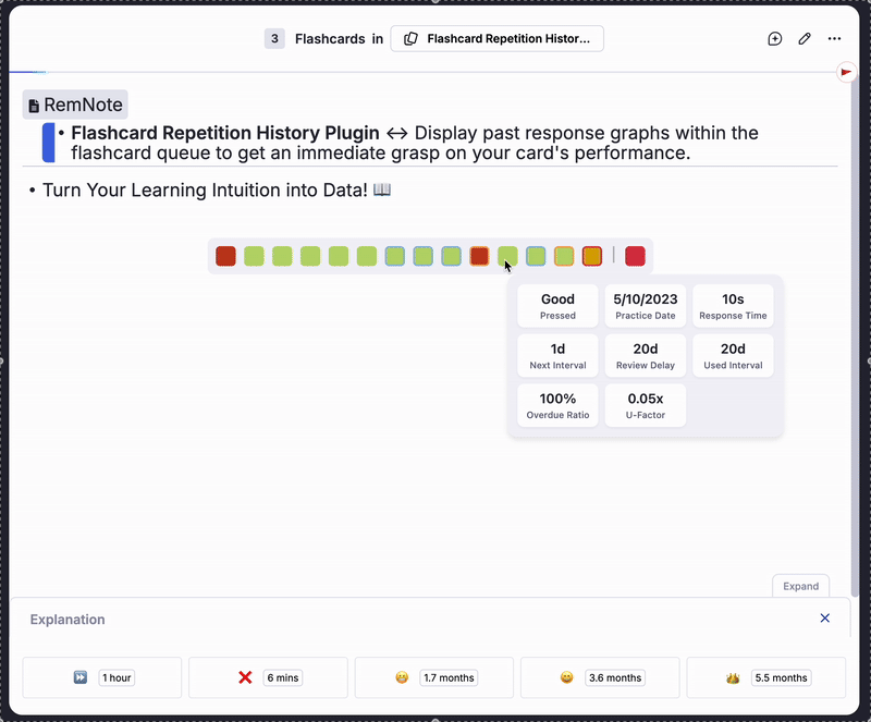 Ever felt like you were "getting the hang of" a topic? Or that you were constantly forgetting a specific card? This plugin transforms those feelings into concrete, visual data. It provides an at-a-glance history of your flashcard performance, empowering you to understand your learning patterns, identify difficult cards, and build a more effective study routine. Stop guessing and start seeing your progress.