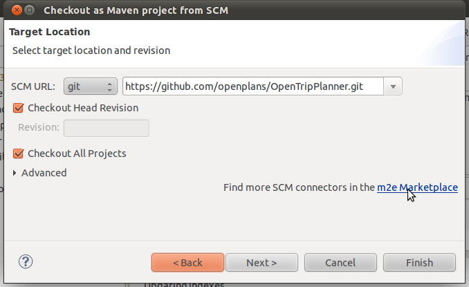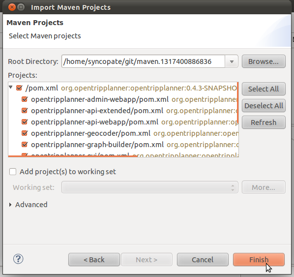 Click Finish, and m2eclipse should both clone the repository and import the Maven projects into your workspace. The opentripplanner top-level maven module, as well as all the sub-modules, should then appear in your project explorer view. There should be small blue 'M' overlays on the project folders to indicate that they have the "Maven nature". Eclipse should begin pulling in Maven dependencies and building OpenTripPlanner, during which time the project folders may also have red 'X' overlays indicating build errors. These should eventually disappear when all dependencies are pulled in and the compilation completes.