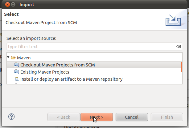 Click Next, and then indicate that you are using the Git version control sytstem using the dropdown box next to the label "SCM URL". NOTE: The first time you use this option, this "git" option will probably not be available because an m2e/git connector must be installed. Use the blue "m2e marketplace" link in the lower right corner of this dialog box to find and install the m2e EGit SCM connector, and the 'git' option should become available in the drop-down box.