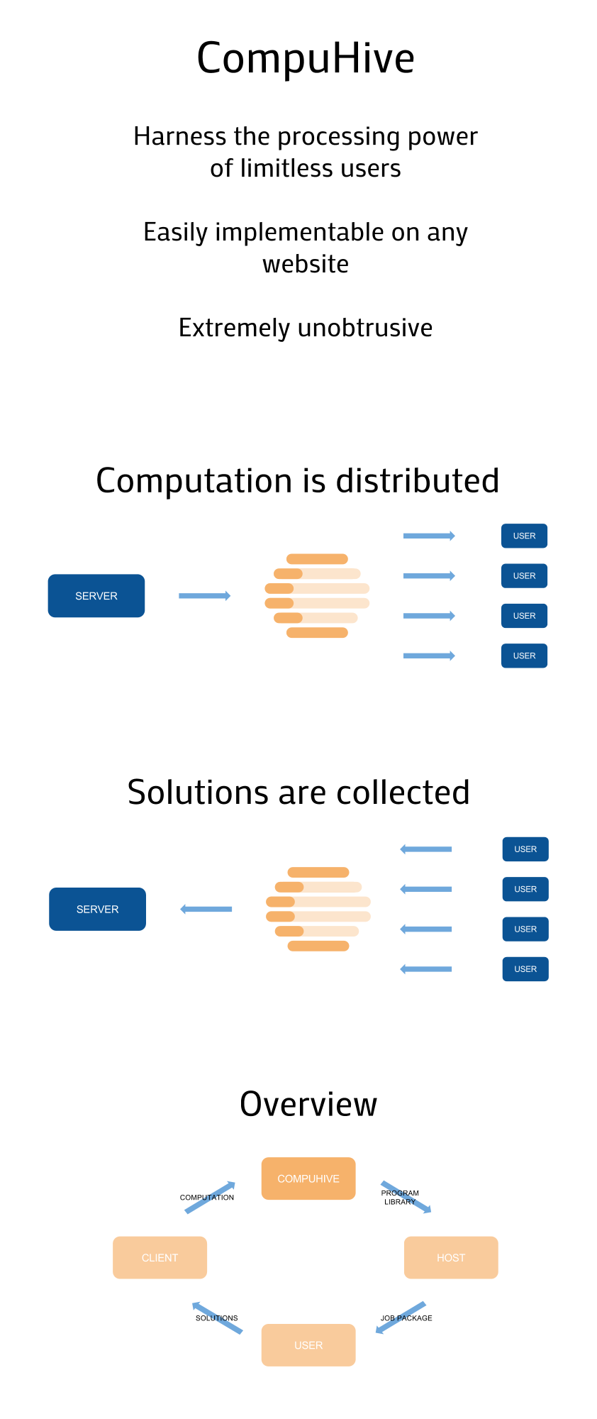 CompuHive is an easy-to-implement JavaScript library that allows a client to harness an enormous amount of processing power from millions of personal computers. High traffic websites will allow Compuhive to run a script in the background of the browser, enabling the client to break-down high volume computations into smaller partitions and distribute them amongst the users of the host page. This process will be virtually unobtrusive to all parties involved.