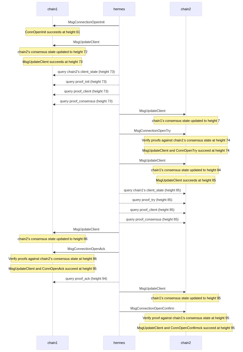 Note over chain1: MsgUpdateClient and ConnOpenAck succeed at height 95