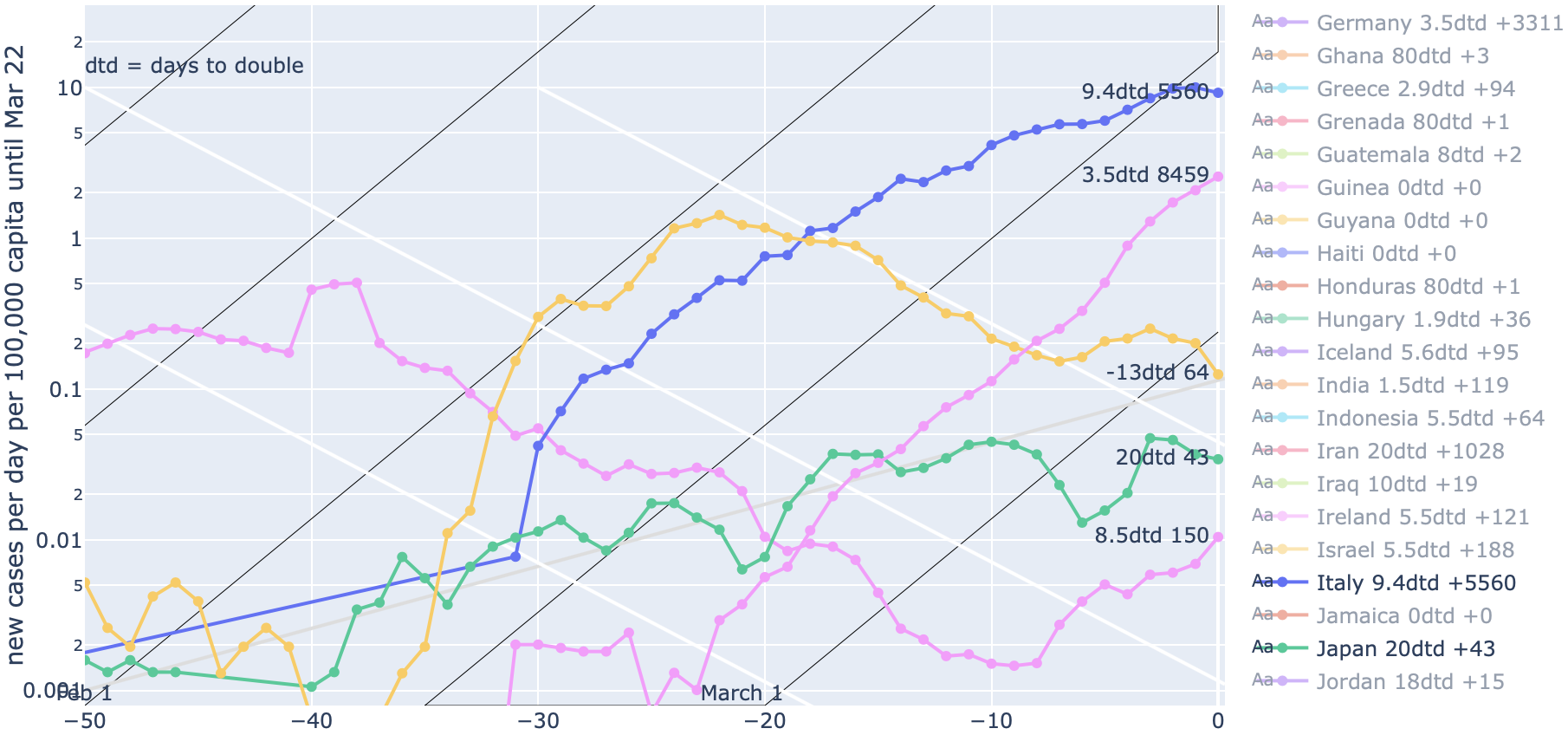 with my rationales given here but I'd also be happy to join forces. I did it because I couldn't find a single source plotting new cases per day on a log scale for a variety of countries.