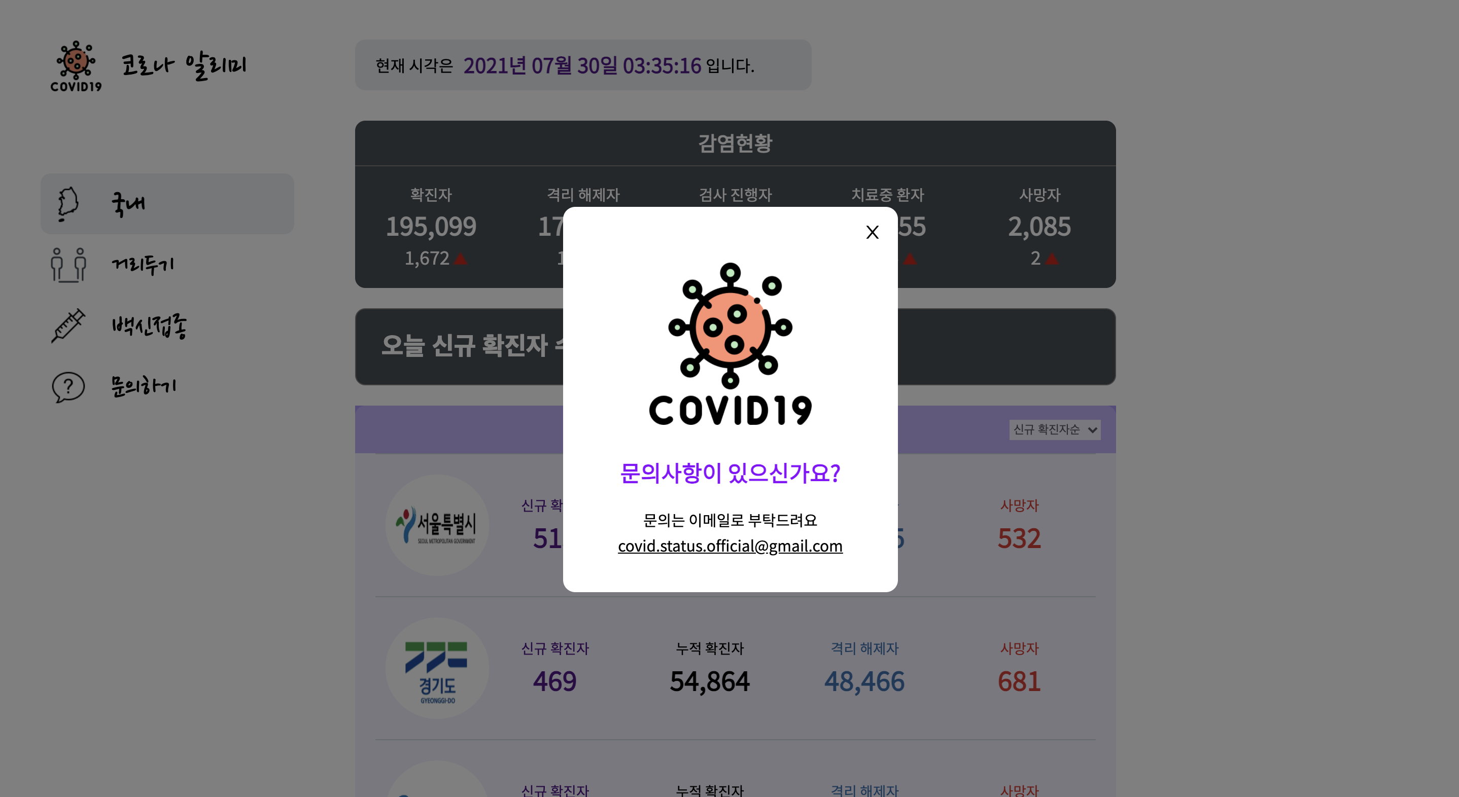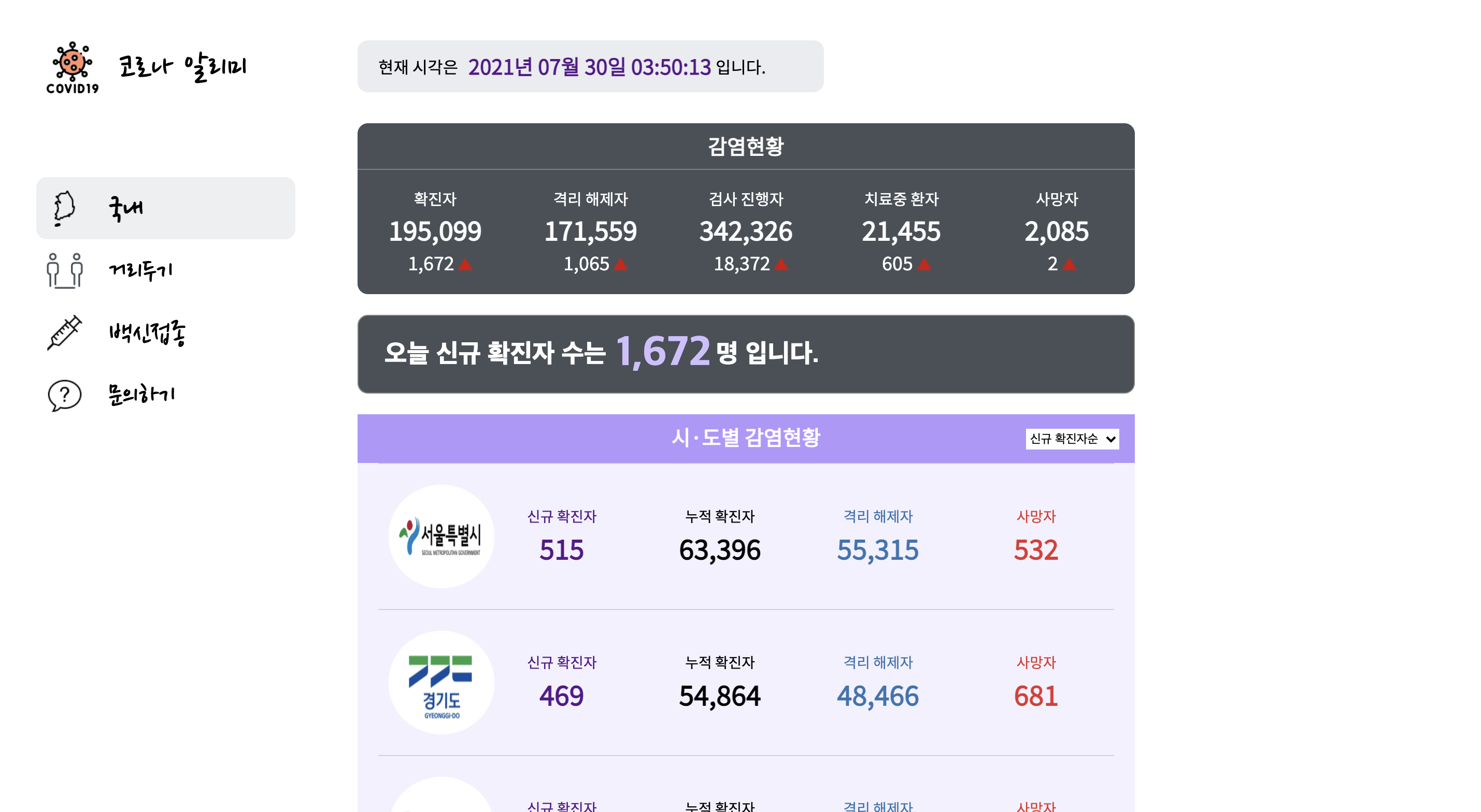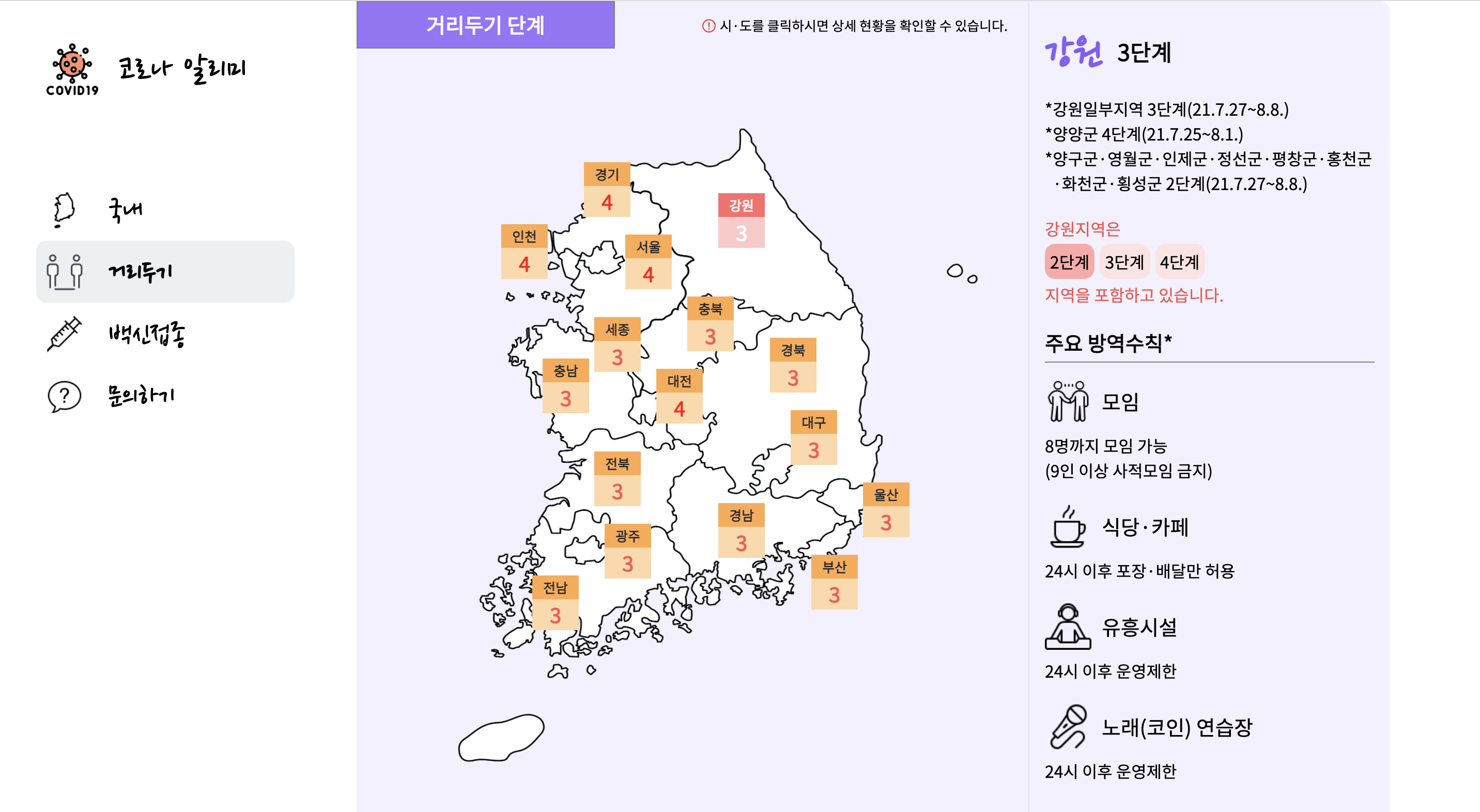 코로나 알리미는 국내감염현황, 백신접종현황, 거리두기 단계에 대한 정보를 모아 보여주는 웹 사이트 입니다.