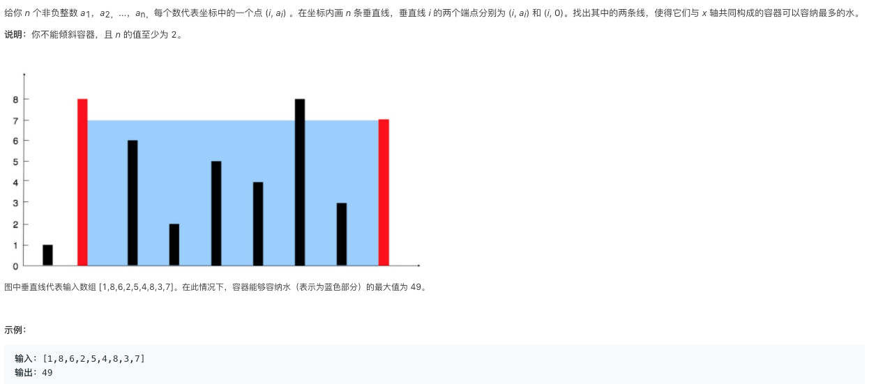 题目描述: 给你 n 个非负整数 a1,a2,...,an,每个数代表坐标中的一个点 (i, ai) 。在坐标内画 n 条垂直线,垂直线 i 的两个端点分别为 (i, ai) 和 (i, 0)。找出其中的两条线,使得它们与 x 轴共同构成的容器可以容纳最多的水。
