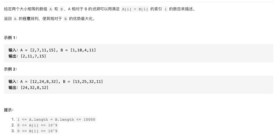 像不像田忌赛马?? 以a最小的牌去对b最大的牌. 先将A数组从小到大排序, B数组也是从小到大排序(但是要保存B原来数组的对应顺序). 然后一一比较A和B, 若大于, 直接取出来, 放在B原来数组的对应位置. 若小于或等于, 则取A数组的最后一个A[end]放入B对应的位置.