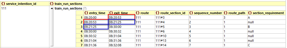 | 6 | pass through all section_requirements | a train_run_section references a section_requirement if and only if this section_requirement is listed in the service_intention. | for example, in the sample solution, the train_run_sections for service_intention 111 have references to the section_requirements A, B and C. But the train_run_sections for service_intention 113 only reference section_requirements A and C: This is because in the sample instance the service_intention for 113 does not have a section_requirement for the section_marker 'B', but only for 'A' and 'C' ![]() |