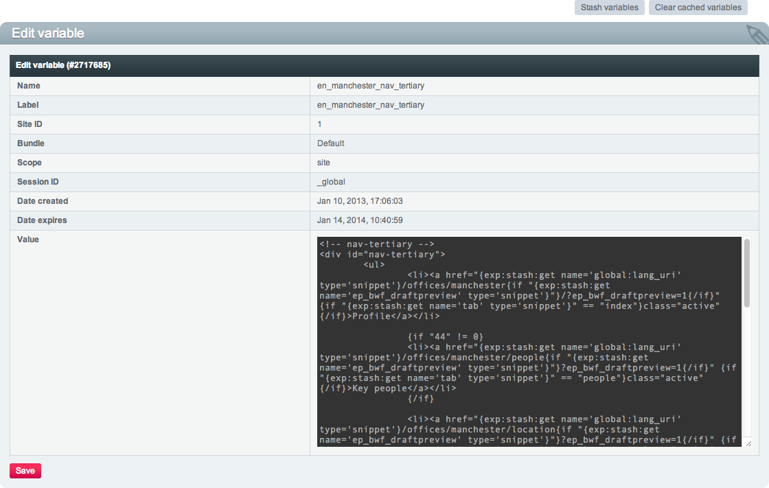 Click on a variable name to edit the content of the variable. If you are editing a variable with an associated static file cache (i.e. a variable assigned to the static bundle), the file will also be updated.