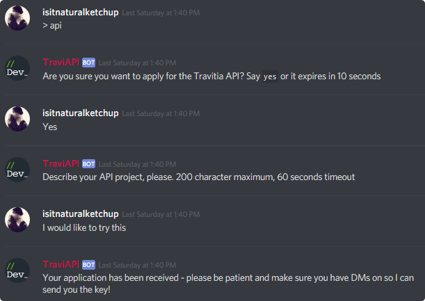 await cleverbot.close()Join the Travitia API Discord server and use the > api command to request an API key.